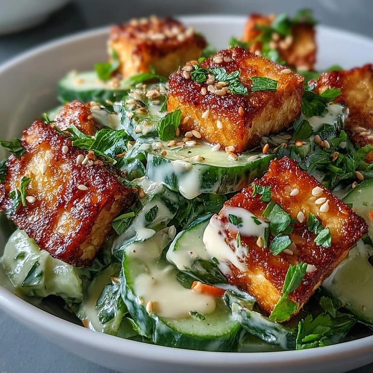 Save There's something about standing in front of an open fridge on a warm afternoon, staring at half a package of tofu and a bunch of cucumbers, that makes you want to create something crisp and alive. I stumbled onto this salad while trying to prove to myself that vegetarian lunches could be exciting, not just virtuous. The moment I bit into that golden, crunchy tofu against the cool, creamy dressing, I realized I'd accidentally made something I'd actually crave.