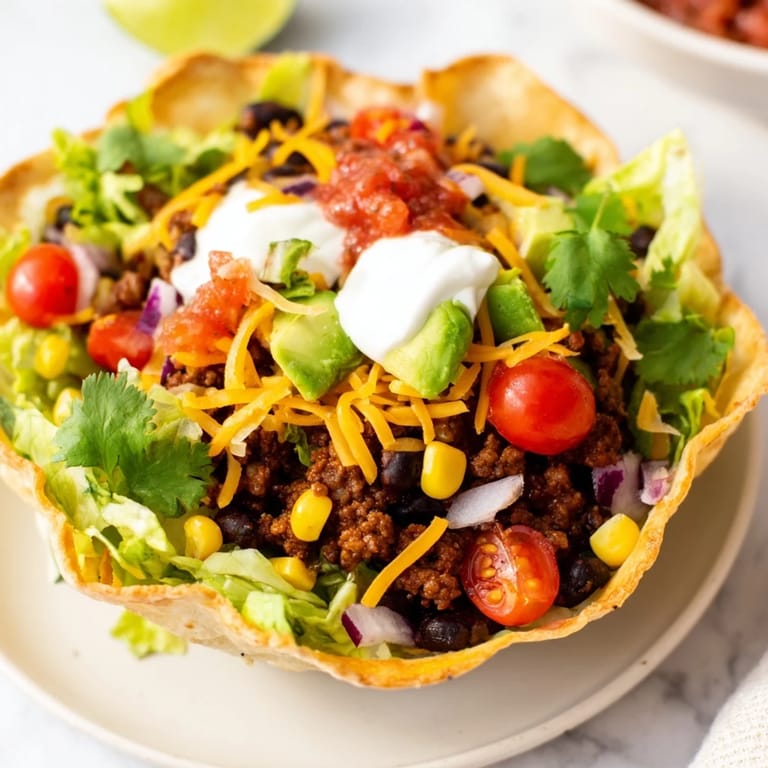 Save My neighbor threw a backyard gathering on a sweltering July afternoon, and I volunteered to bring something that wouldn't wilt in the heat. I'd seen taco salads at restaurants but never made one at home—until that day when I realized the crispy tortilla bowl could hold everything I loved about tacos without the mess of eating them with my hands. The first time I pulled a golden bowl from the oven, still steaming and perfectly curved, I knew I'd found something special. Now whenever I make this, I can almost feel that summer breeze and hear the laughter around the table.